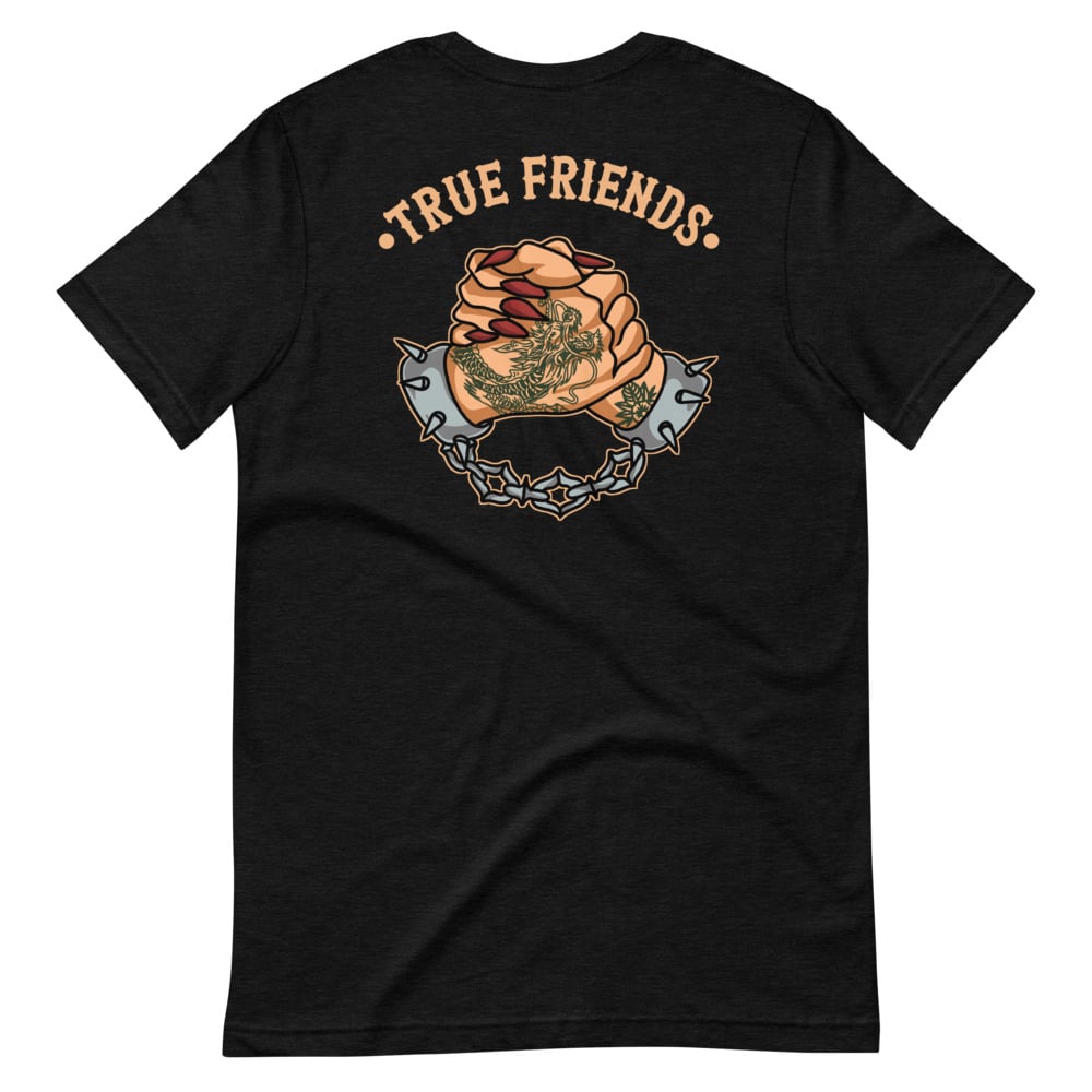True Friends print on the back and blank on the front. It feels soft and lightweight, with the right amount of stretch. It's comfortable and flattering for both men and women.